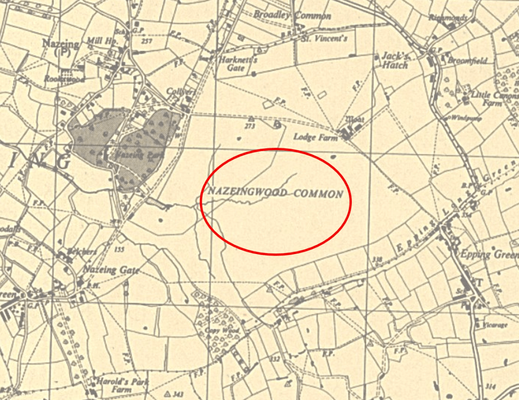This O.S. Map below shows (circled in red) the area of Nazeing Common that was the site of the Dummy Airfield.