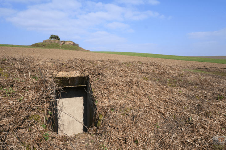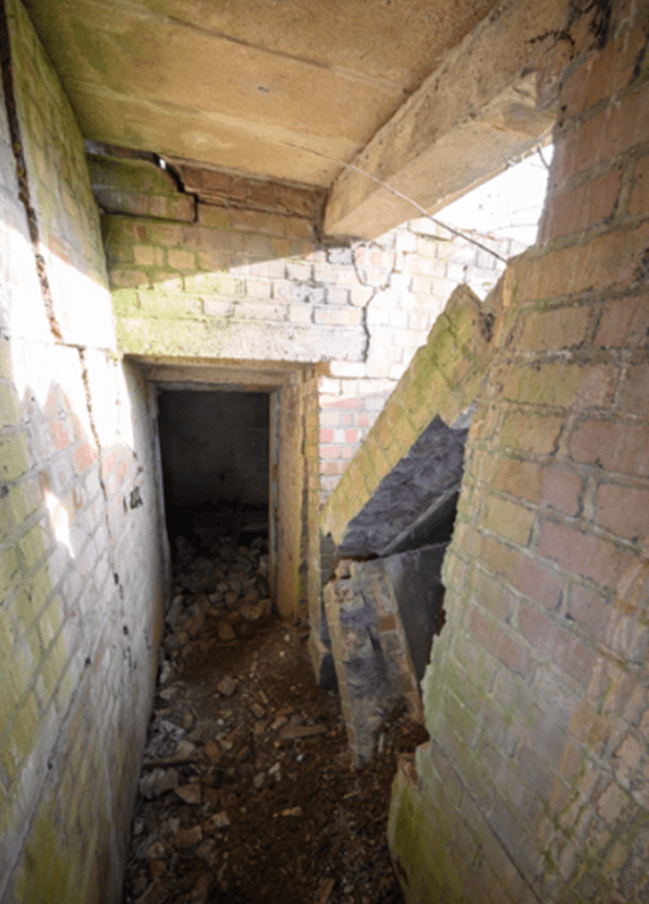 The northern night shelter features the operations room and engine room, both accessed by the corridor off the entrance. The operations room was equipped with an escape hatch at one end. The engine room would have connected to the pipes outside to pump out the fuel. This shelter was made of brick and concrete above ground and surrounded by earth, and although of very solid construction, the entrance has collapsed – possibly intentionally destructed in a vain attempt to seal the bunker.