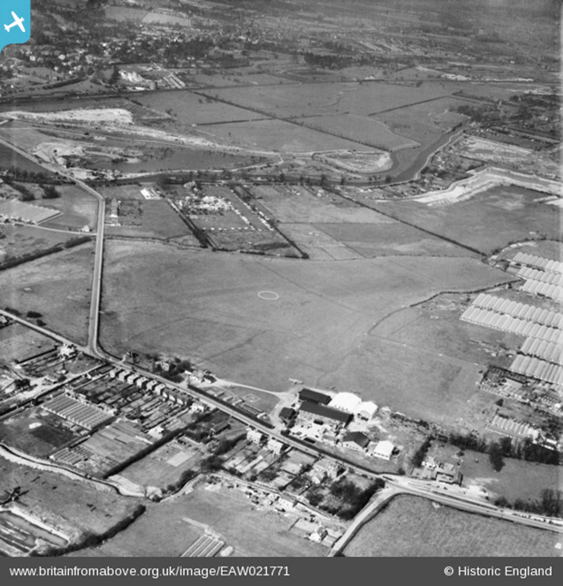 This aerial photo ( above) clearly shows Nazeing New Road and its junction with Old Nazeing Road, known as Aerodrome Corner by all long-standing Nazeing residents. The relief channel now passes under Nazeing Road at this point. The circle in the centre of the open field denotes the centre of the grass airfield. There are hangers and workshops on the right of the entrance and glass houses situated in Nursery Road on the extreme right of the photo.