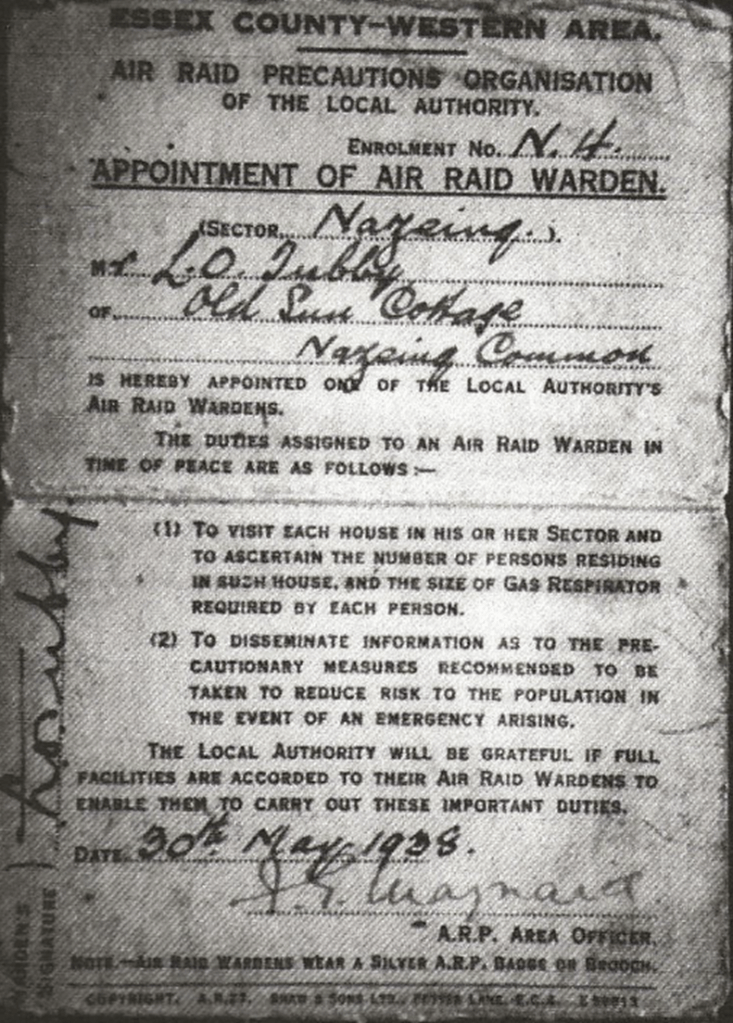 The 1939 Register listed 9 yr old Robert Tubby’s father, Leslie, as a Shipping Clerk and ARP Warden. He was in charge of ARP Warden’s post B9 at Old Sun House. Leslie wasn’t born in the village. He married Beatrice Jacobs who was living at Greenleaves, Hoe Lane. They were married at All Saints, Nazeing in 1928. Leslie’s wife , Beatrice became a warden in 1940.